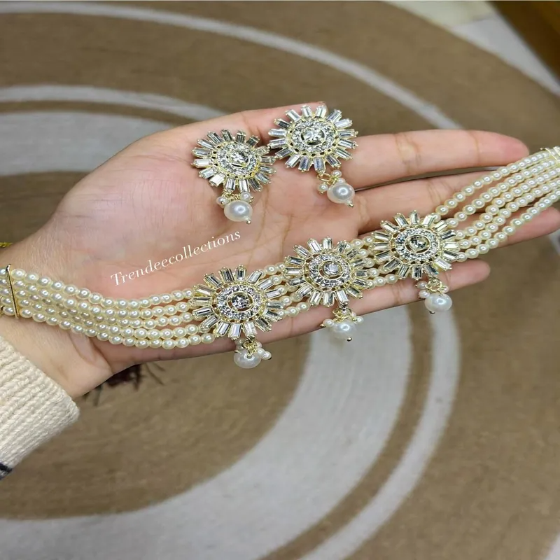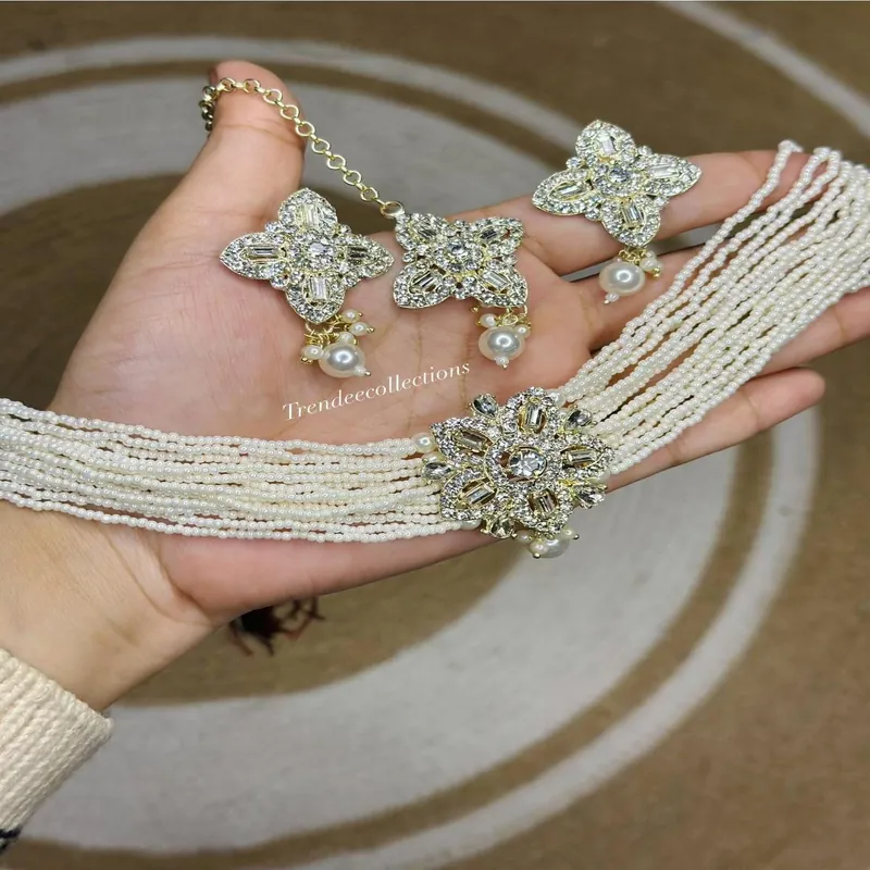 এই Diamond Cut Pearl Choker Set আধুনিক ও ট্র্যাডিশনাল স্টাইলের এক পারফেক্ট কম্বিনেশন। প্রতিটি চোকারে রয়েছে ঝকঝকে Diamond Cut Stone Work, মাল্টি-লেয়ার Pearl Beads, এবং এলিগেন্ট সেন্টার মোটিফ, যা ব্রাইডাল লুকে আনে একদম রাজকীয় ফিনিশ।