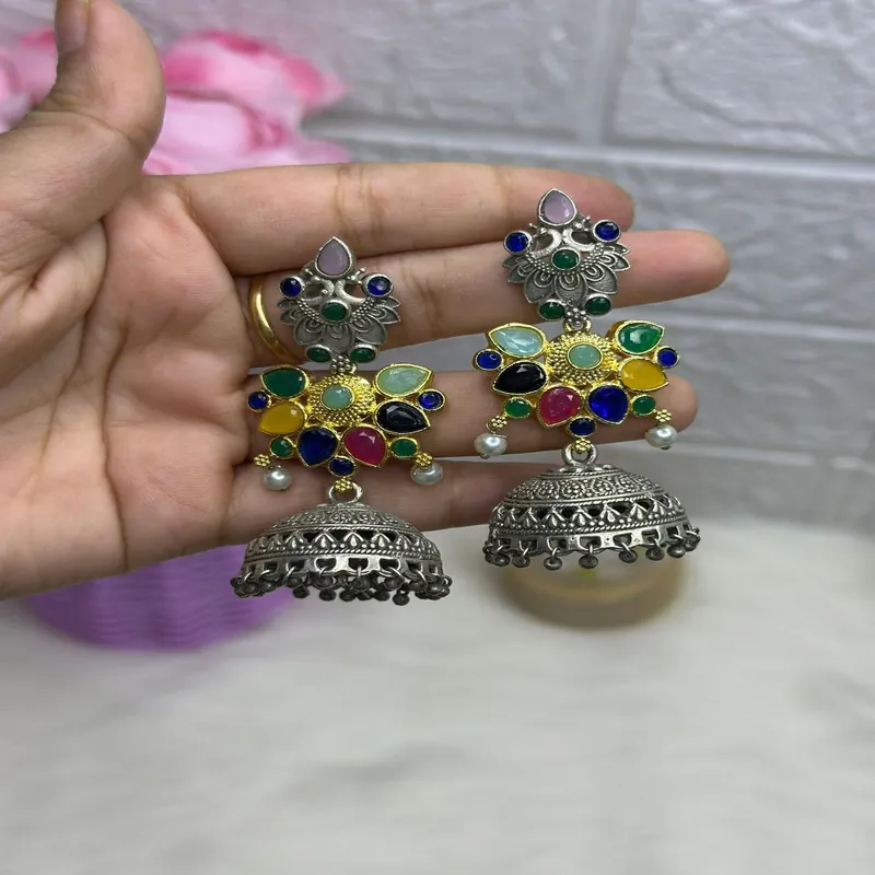 এই সুন্দর German Silver Jhumka Earrings টি তৈরি করা হয়েছে প্রিমিয়াম কোয়ালিটির জার্মান সিলভার দিয়ে, যার উপর রয়েছে আকর্ষণীয় Multi Colour Stone ও অ্যান্টিক ফিনিশ।