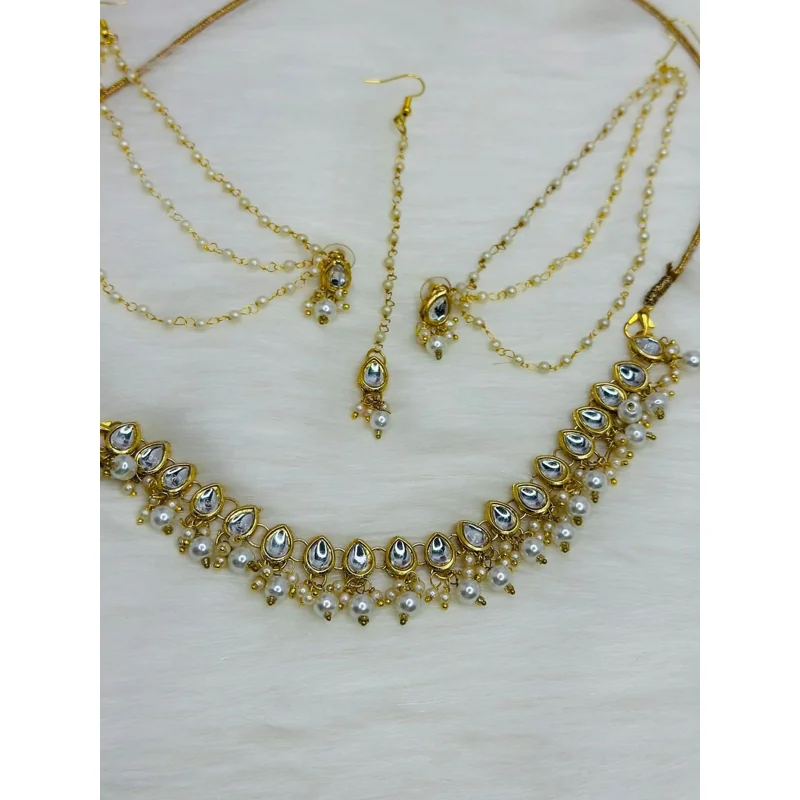 এই Gold Polished Kundan Necklace Setটি তৈরি করা হয়েছে ঐতিহ্যবাহী রাজকীয় ডিজাইনে, যেখানে রয়েছে ঝলমলে Kundan stone ও নরম Pearl drop detailing।