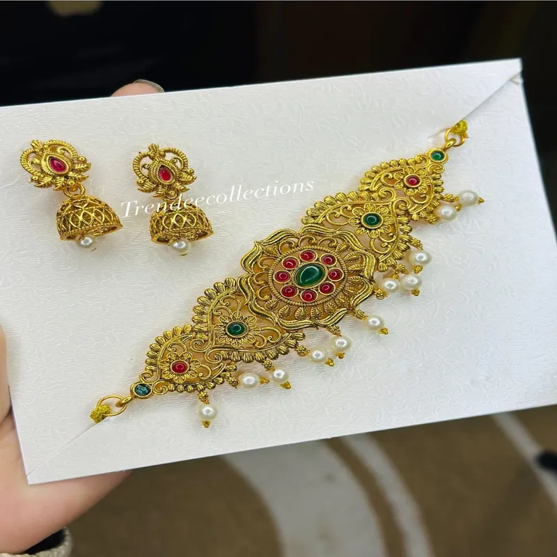 এই সাউথ ইন্ডিয়ান চোকার সেটের সাথে ম্যাচিং Jhumka Earrings দেওয়া আছে, ফলে সম্পূর্ণ একটি রেডি লুক পাওয়া যায়। শাড়ি, লেহেঙ্গা কিংবা যেকোনো ট্র্যাডিশনাল আউটফিটের সাথে এটি দারুণভাবে মানিয়ে যায়।