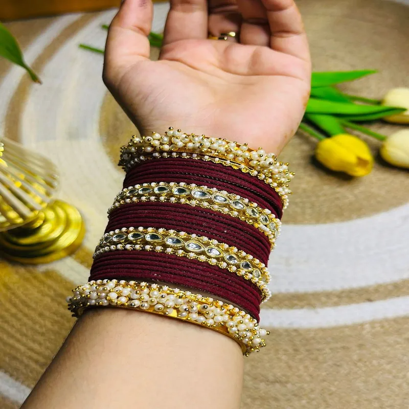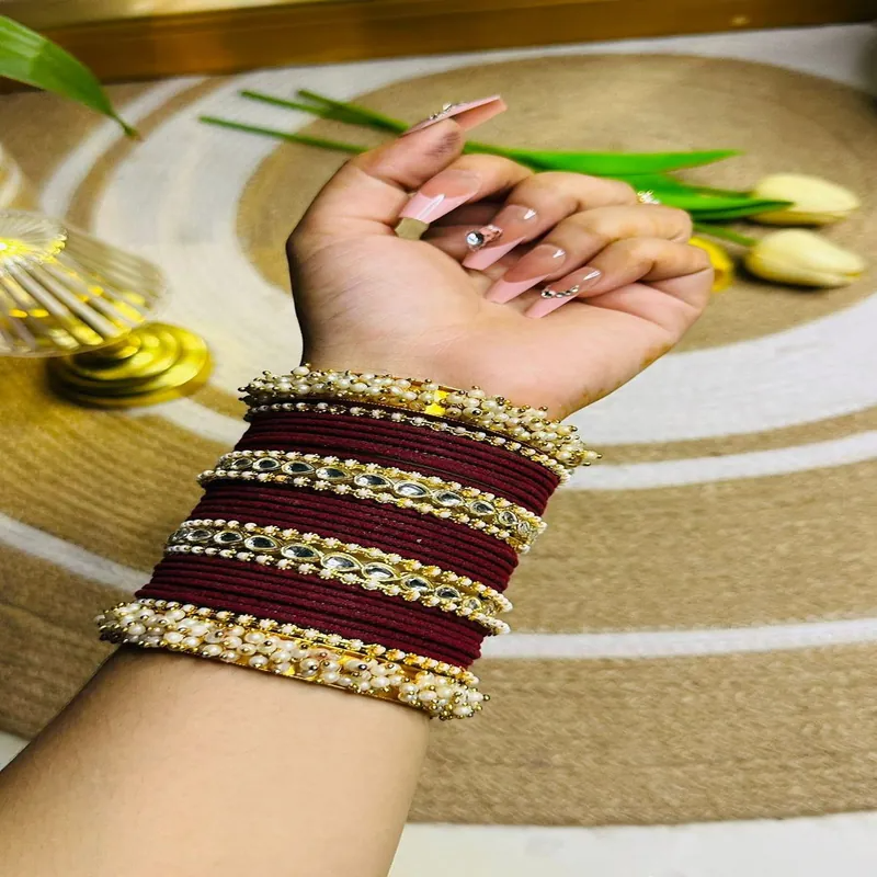 বিয়ের দিনের সাজকে আরও রাজকীয় ও নজরকাড়া করে তুলতে এই Premium Maroon Bridal Churi Set একটি অসাধারণ পছন্দ। গভীর ম্যারুন রঙের মসৃণ চুড়ির সাথে রয়েছে ঝলমলে Kundan Stone Work ও সূক্ষ্ম Pearl Detailing, যা কনেদের হাতে এনে দেয় একদম ক্লাসিক ও এলিগেন্ট ব্রাইডাল ফিনিশ।