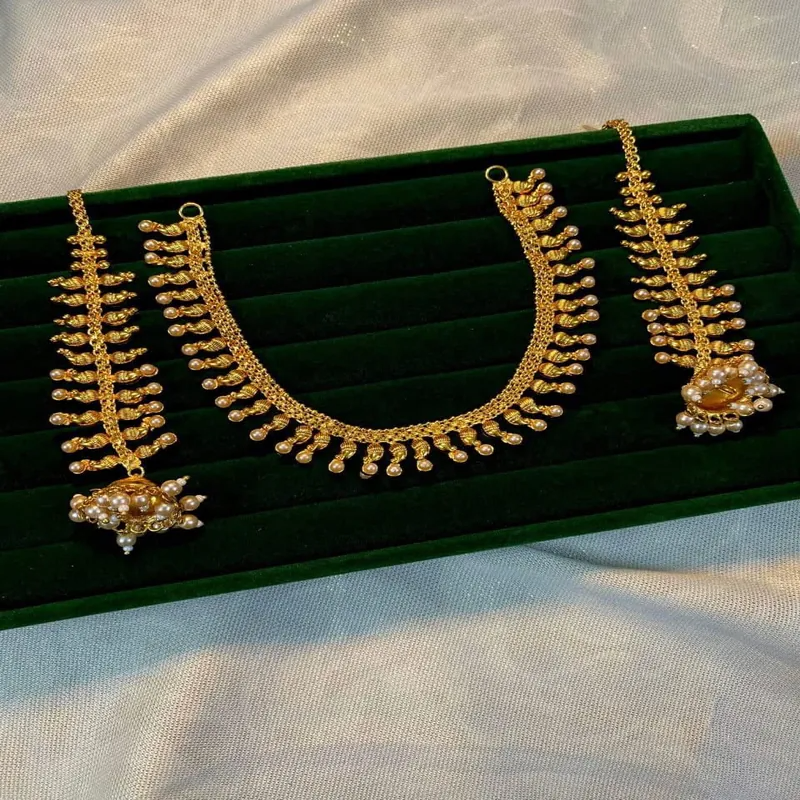 উভয় ডিজাইনেই রয়েছে দক্ষিণ ভারতীয় স্টাইলের সূক্ষ্ম কারুকাজ ও ঝুলন্ত Pearl Drop Detailing, যা গহনাটিকে করেছে আরও গ্রেসফুল ও ক্লাসিক।